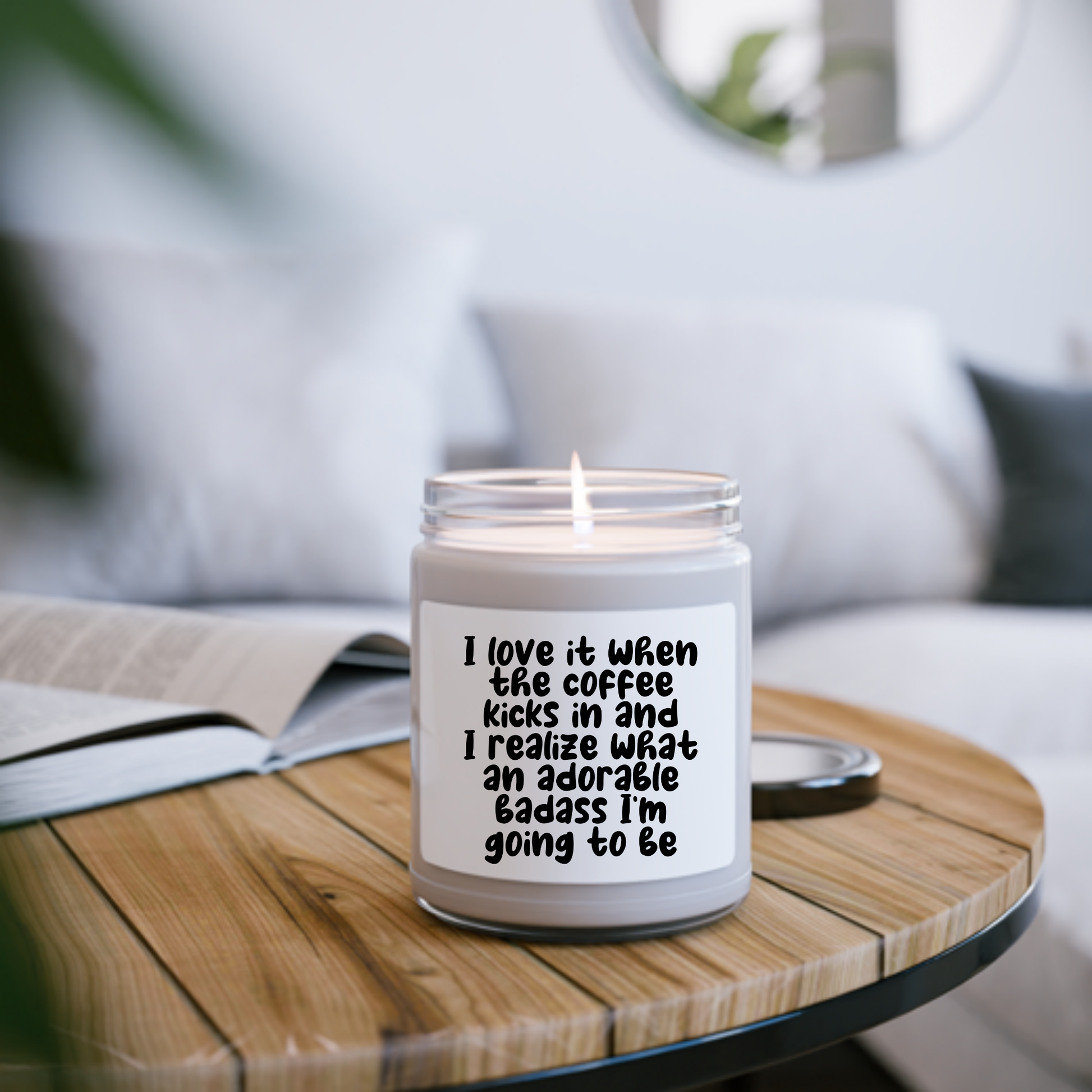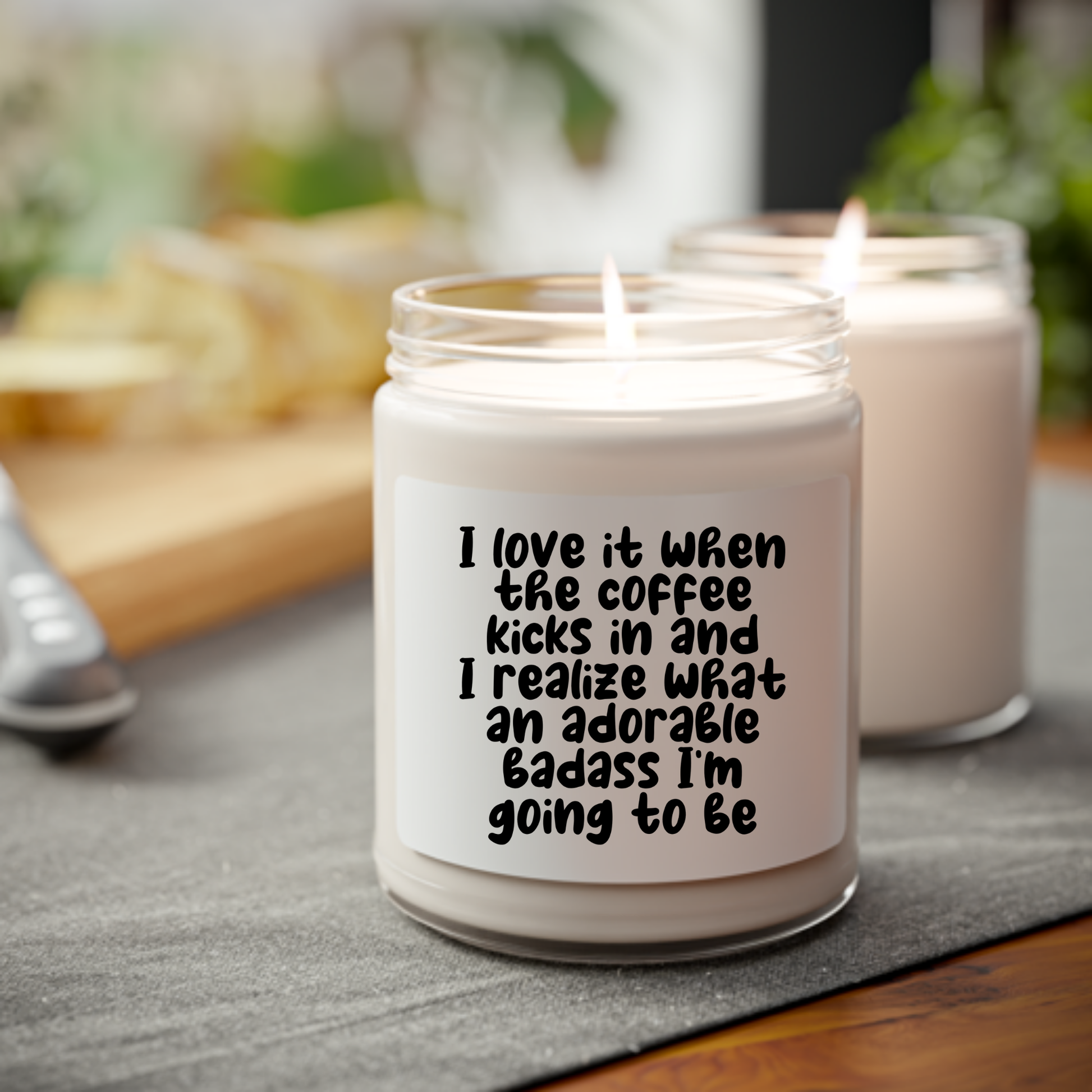 "I love it when the coffee kicks in and I realize what an adorable badass I'm going to be." This humorous candle will brighten your home and makes a fun gift for friends. Great for holiday gift giving, birthday gifts for friends, Mother's Day, or just to indulge yourself.
