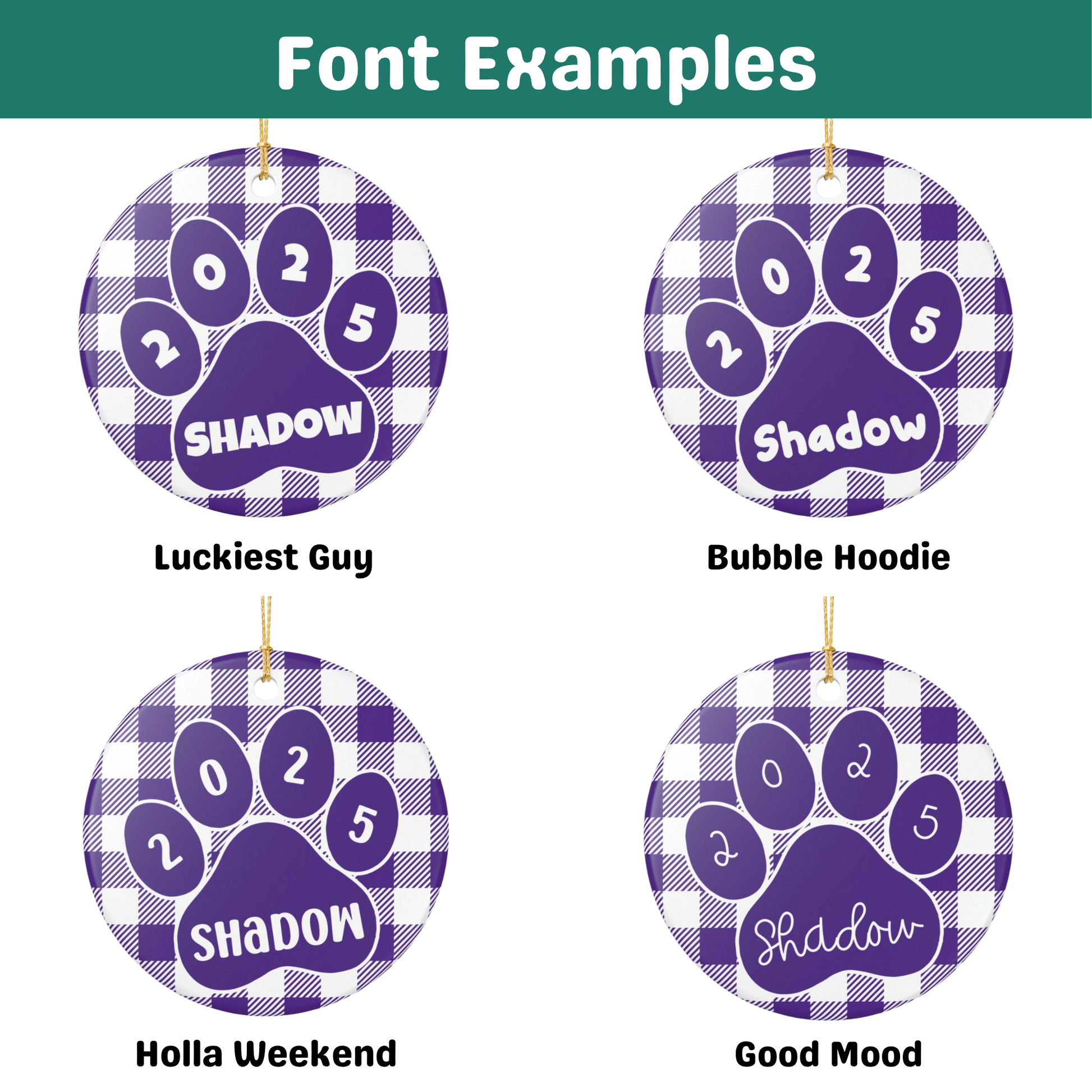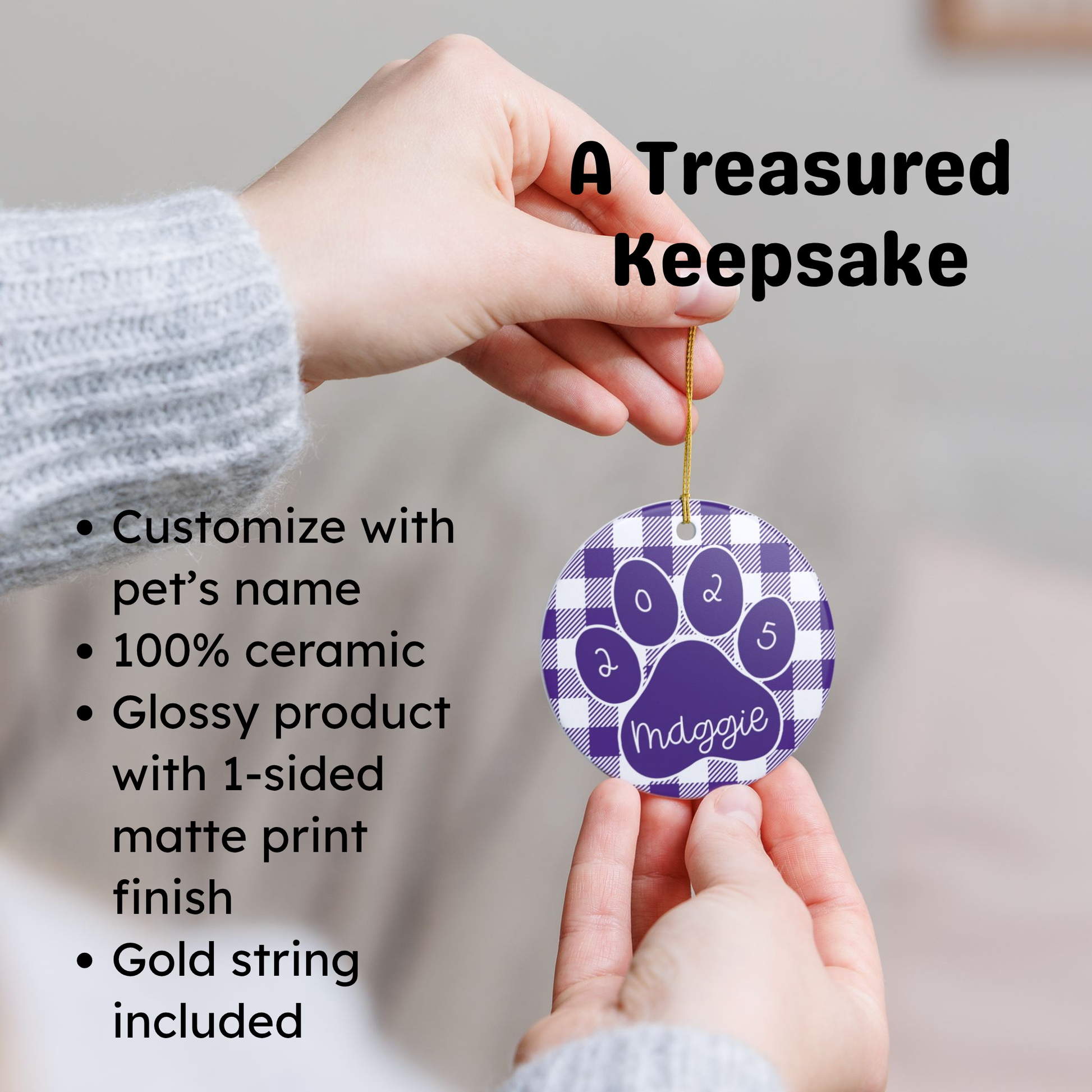 Custom Pet Name Ornament - Purple & White Plaid 2025:
