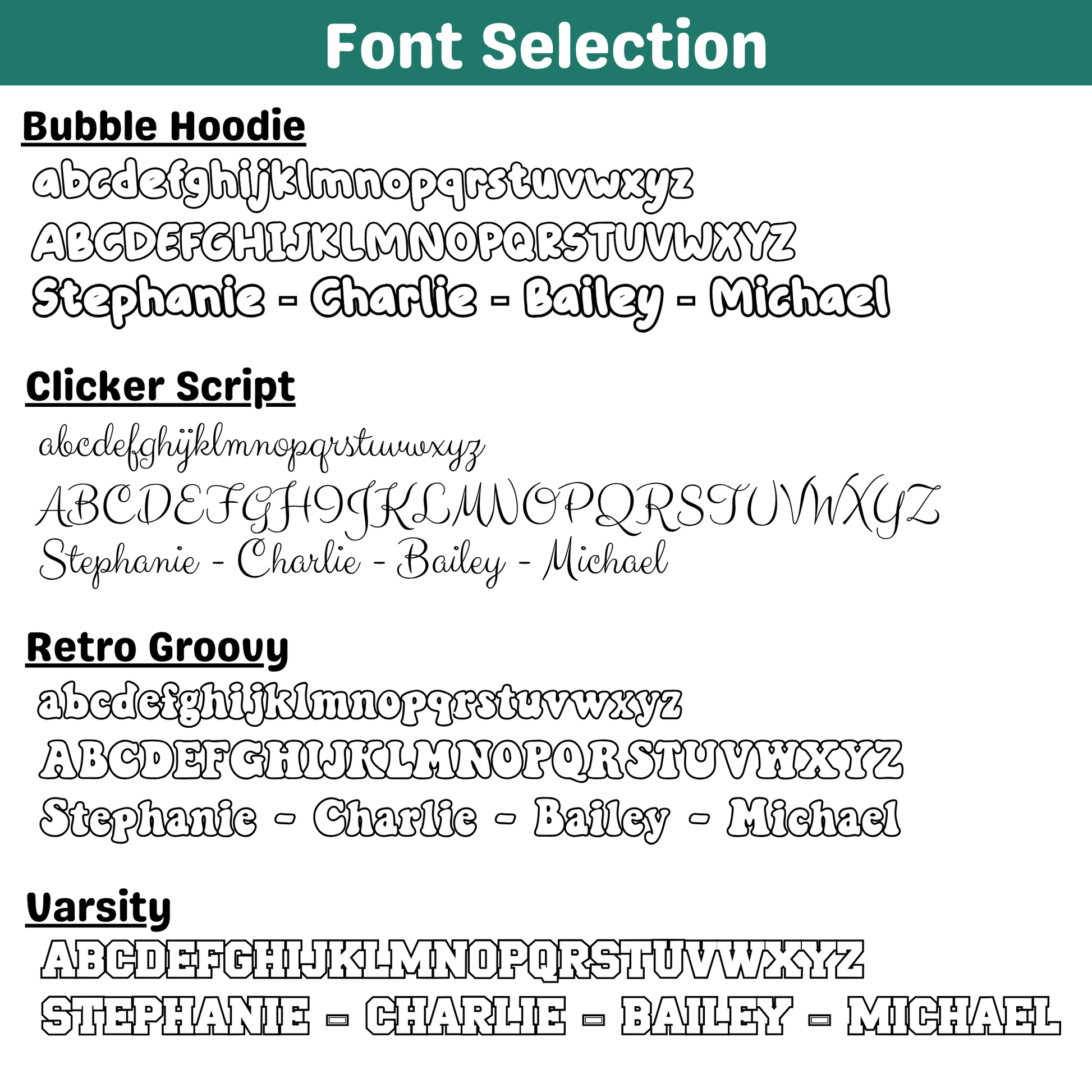 Personalization: Select desired font. Enter up to 12 characters (including spaces) for desired name.
