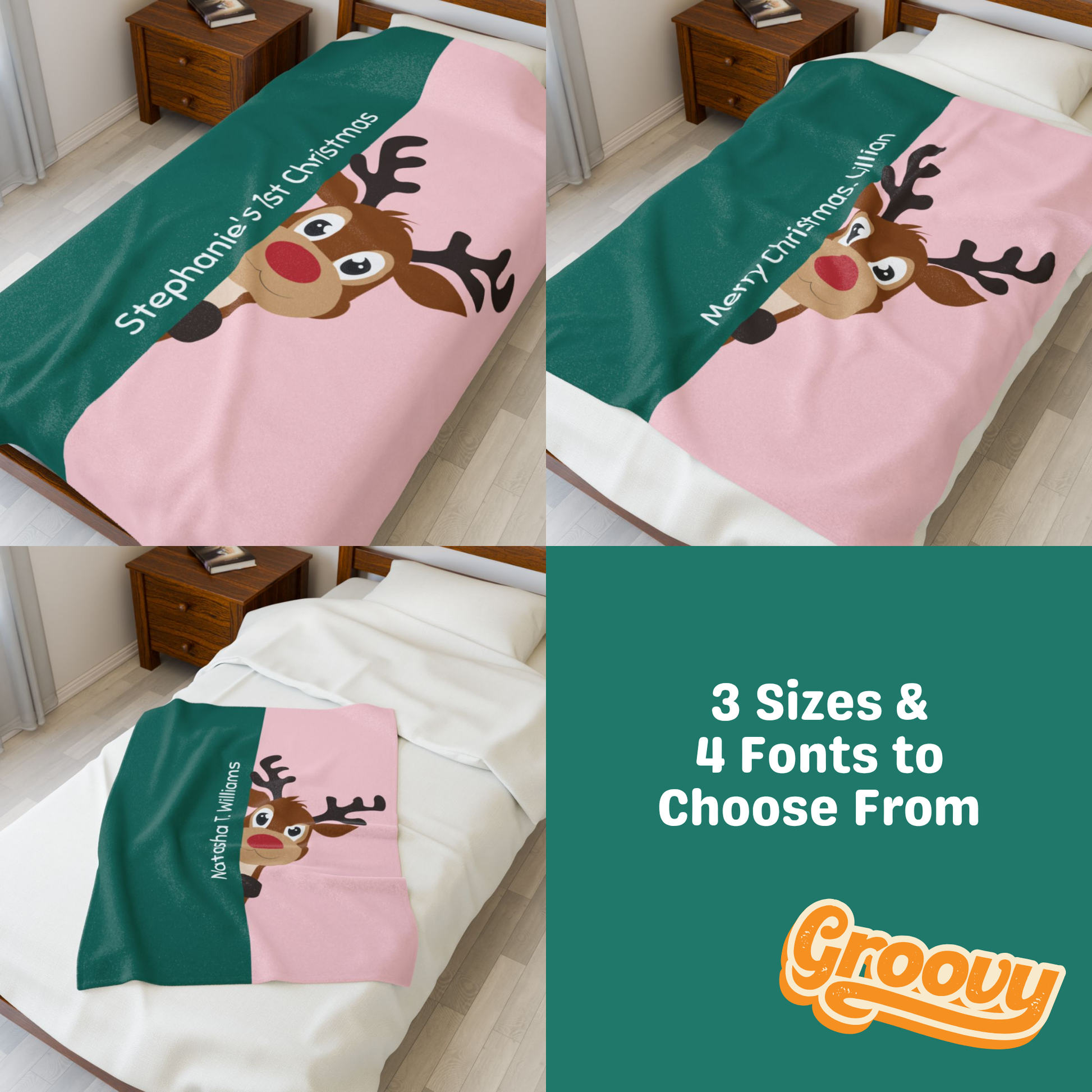 Create a custom cozy holiday keepsake with this darling velveteen plush blanket. It’s soft to touch and makes the perfect Christmas gift for girls on your holiday shopping list. This blanket features a cute peekaboo reindeer design and is printed on one side. Customize the blanket with desired name for a gift to be cherished for years to come. Available in three sizes: 30x40", 50x60", 60x80".