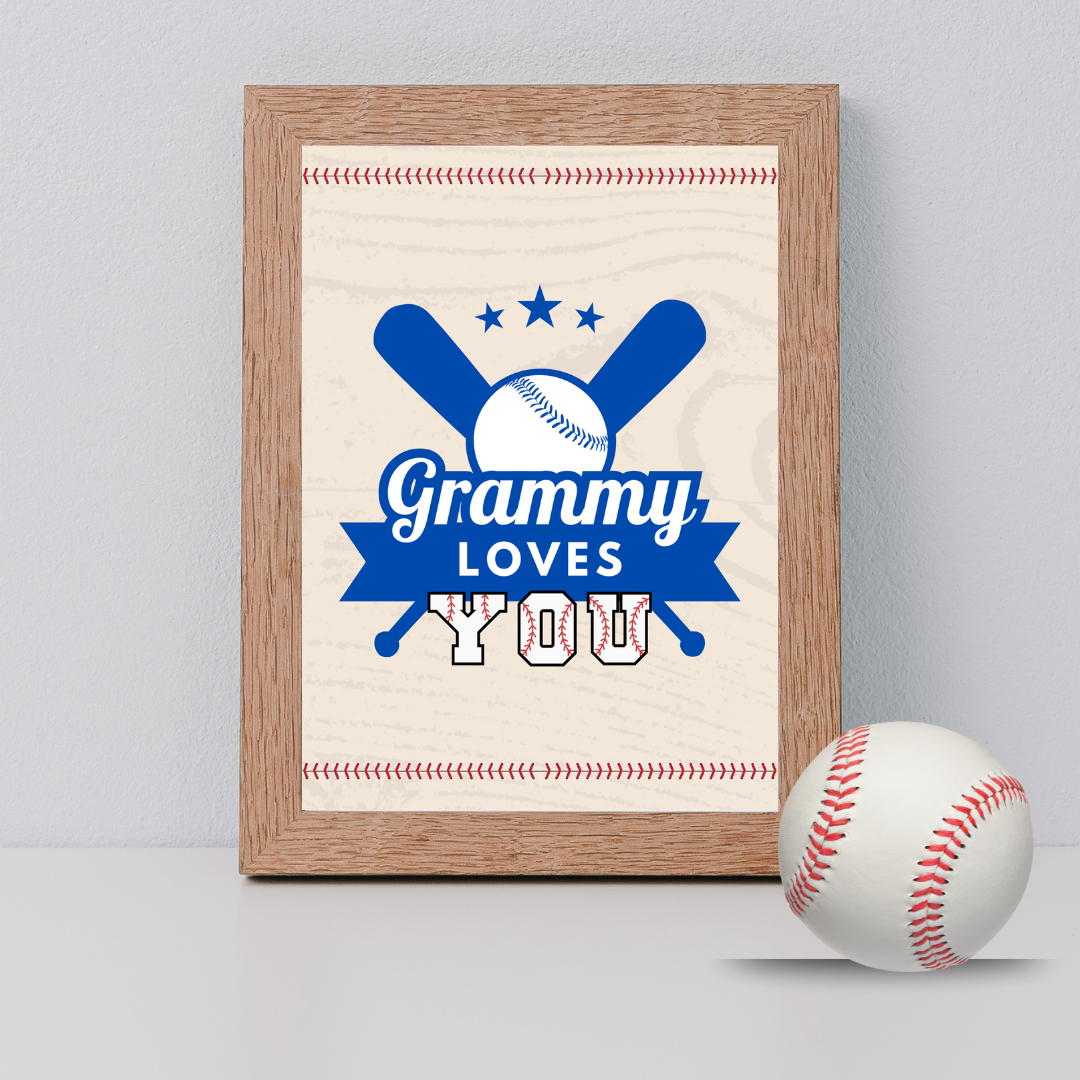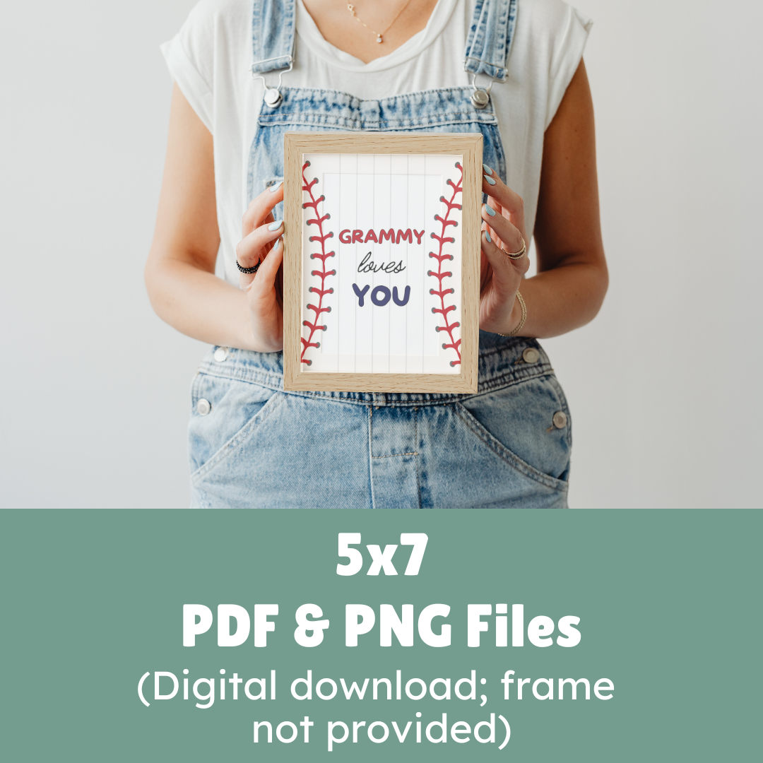 Baseball-themed 5x7 printable digital art files. Four unique designs that say, “Grammy Loves You” and 4 designs that say, “Grandma Loves You.” Files provided in PDF and JPG formats, making it easy to print at home, frame, and give to your grandchildren.