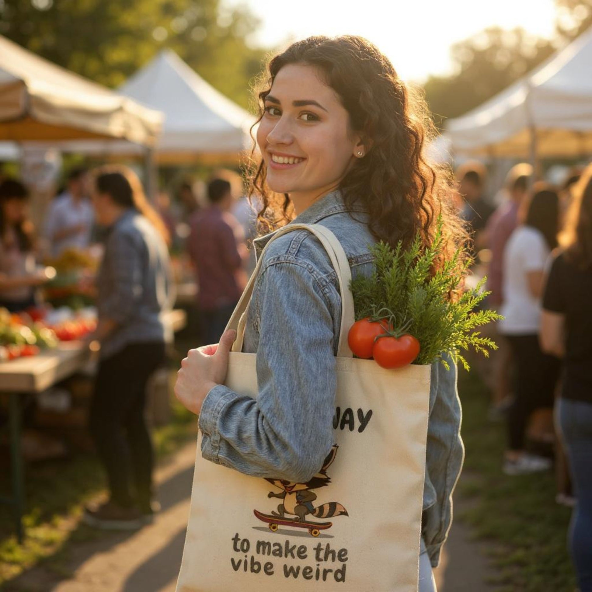 Add a fun twist to your everyday haul with this cotton canvas tote bag. With its quirky design featuring a skateboarding raccoon and the playful phrase "On my way to make the vibe weird," this tote brings a light-hearted spirit to your shopping trips, picnics, or daily errands. Whether you’re hitting the farmer’s market, going to the beach, or just running errands, this tote fits seamlessly into your lifestyle. Perfect for eco-conscious individuals, students, or anyone who loves a casual, laid-back vibe. Ideal for holidays, birthday gifts, or as a treat for yourself, this tote bag brings joy to any occasion.