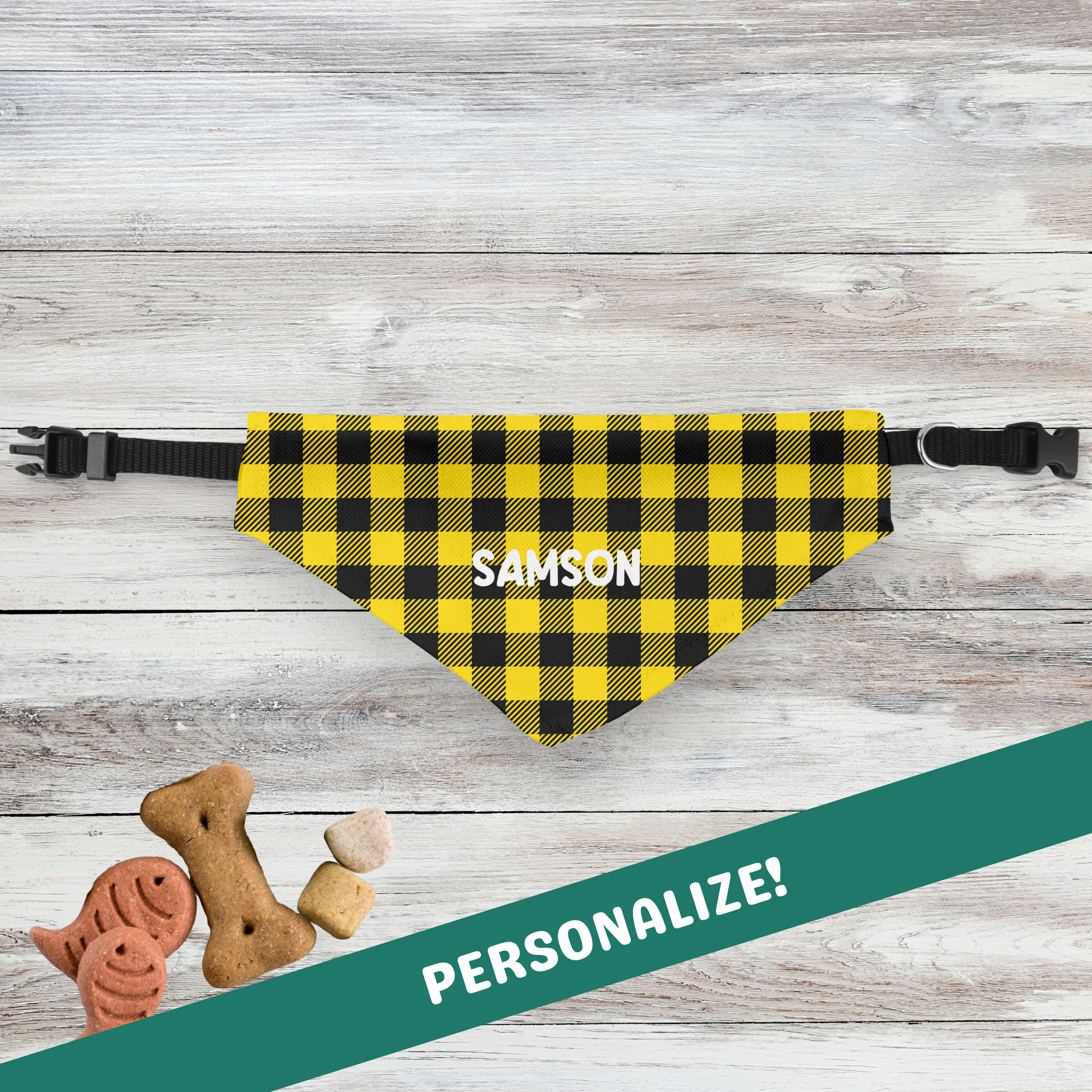 Personalized Clip-on Pet Bandana - Black & Yellow Plaid
