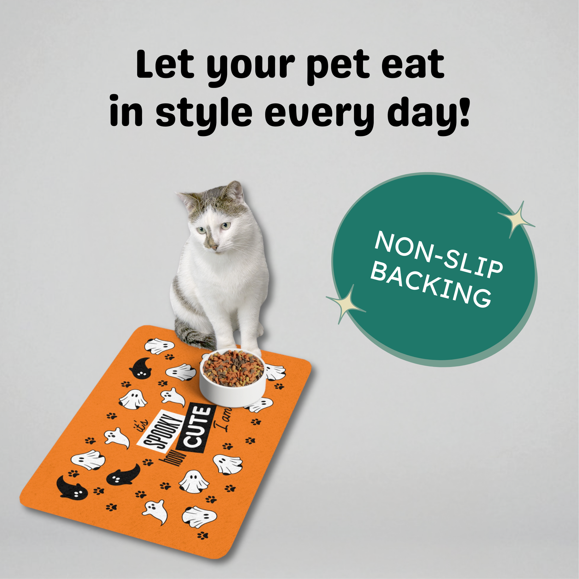 Created for minimizing mess, this darling pet food mat is as practical as it is fun. Made with a non-slip rubber base, this pet feeding mat stays put even when the clumsiest puppers are having their meal. Each mat comes in a 12" x 18" rectangle shape, is thick, and is great for both dogs and cats. Perfect for pet owners who want to combine functionality with aesthetics. Ideal for pet lovers who love decorating for Halloween and the fall season.
