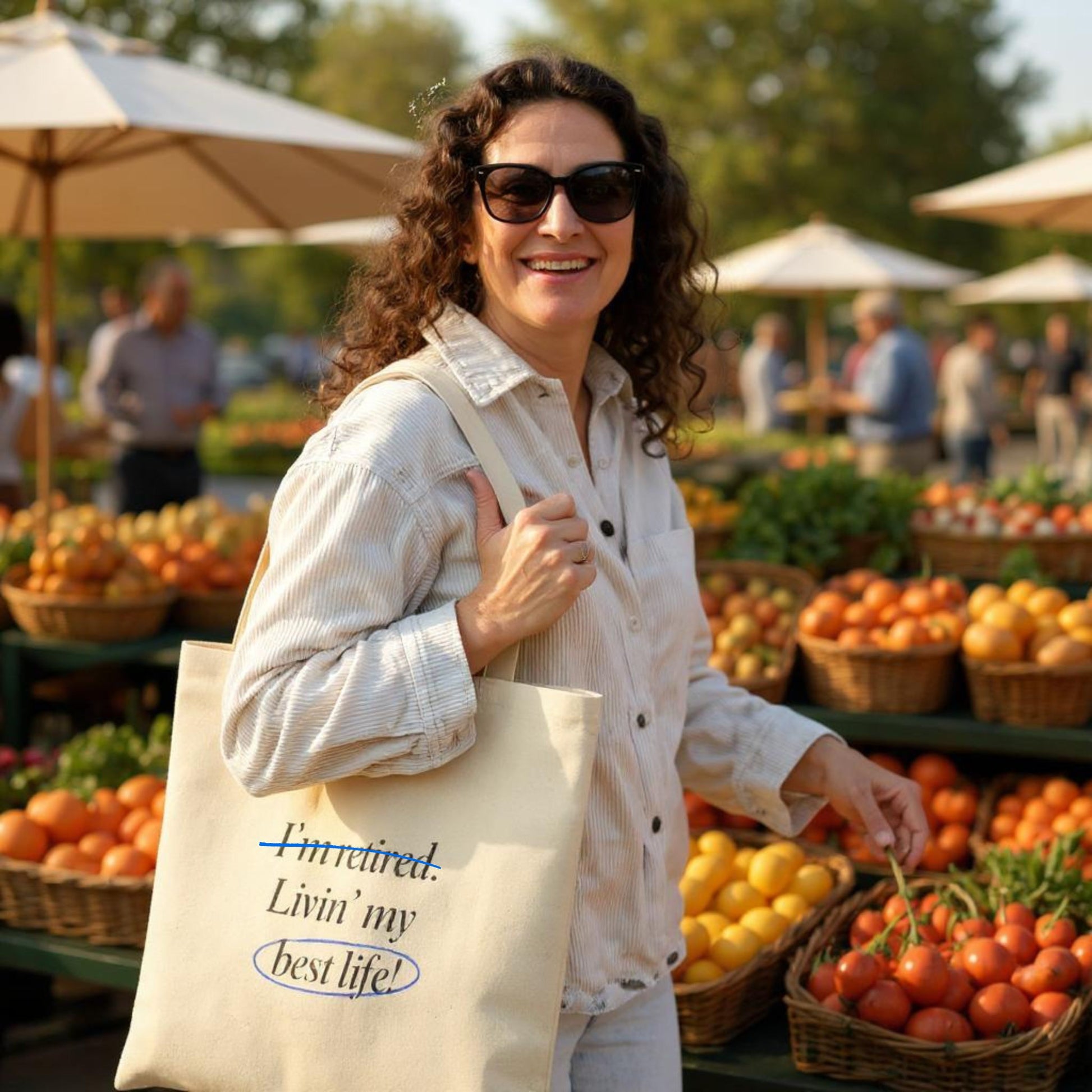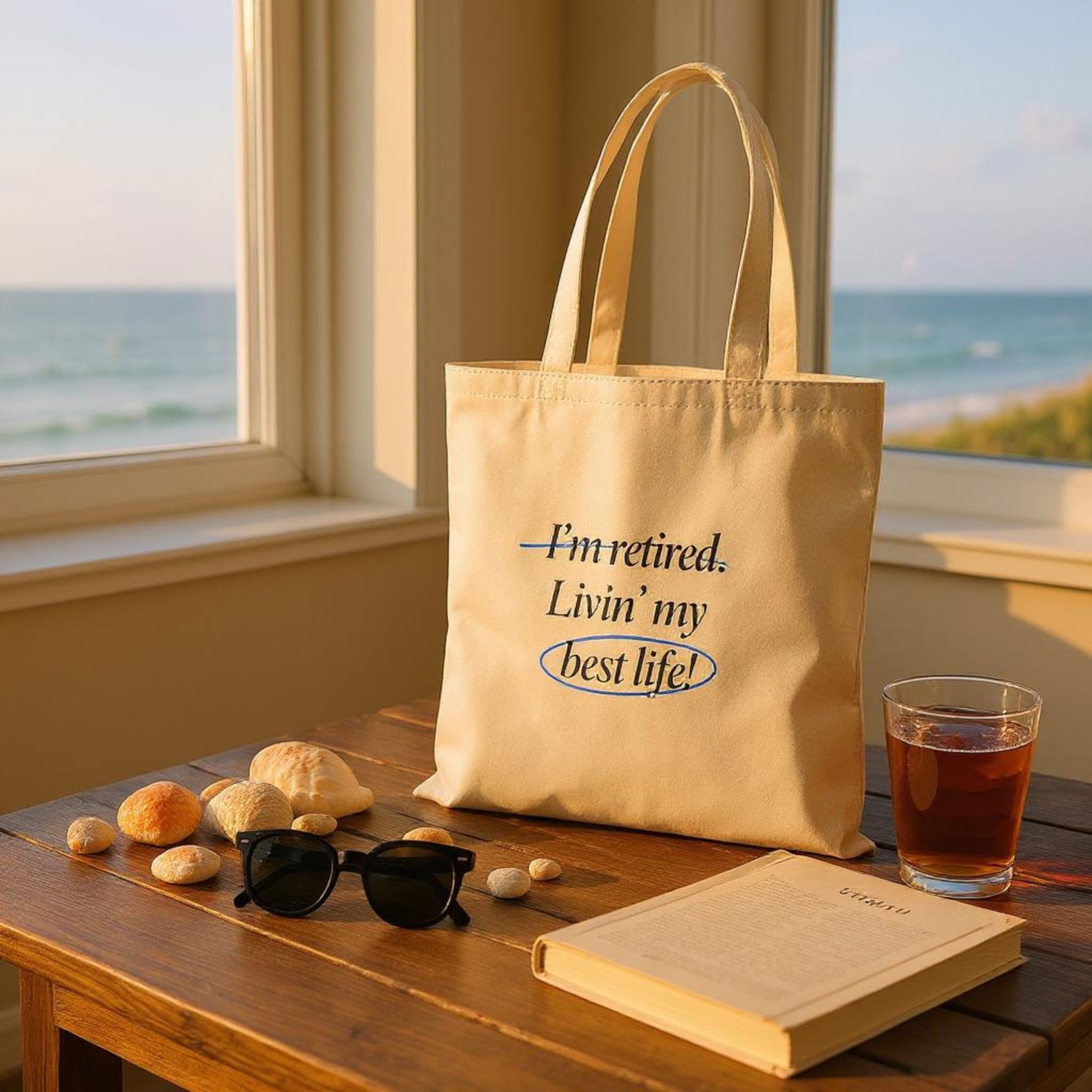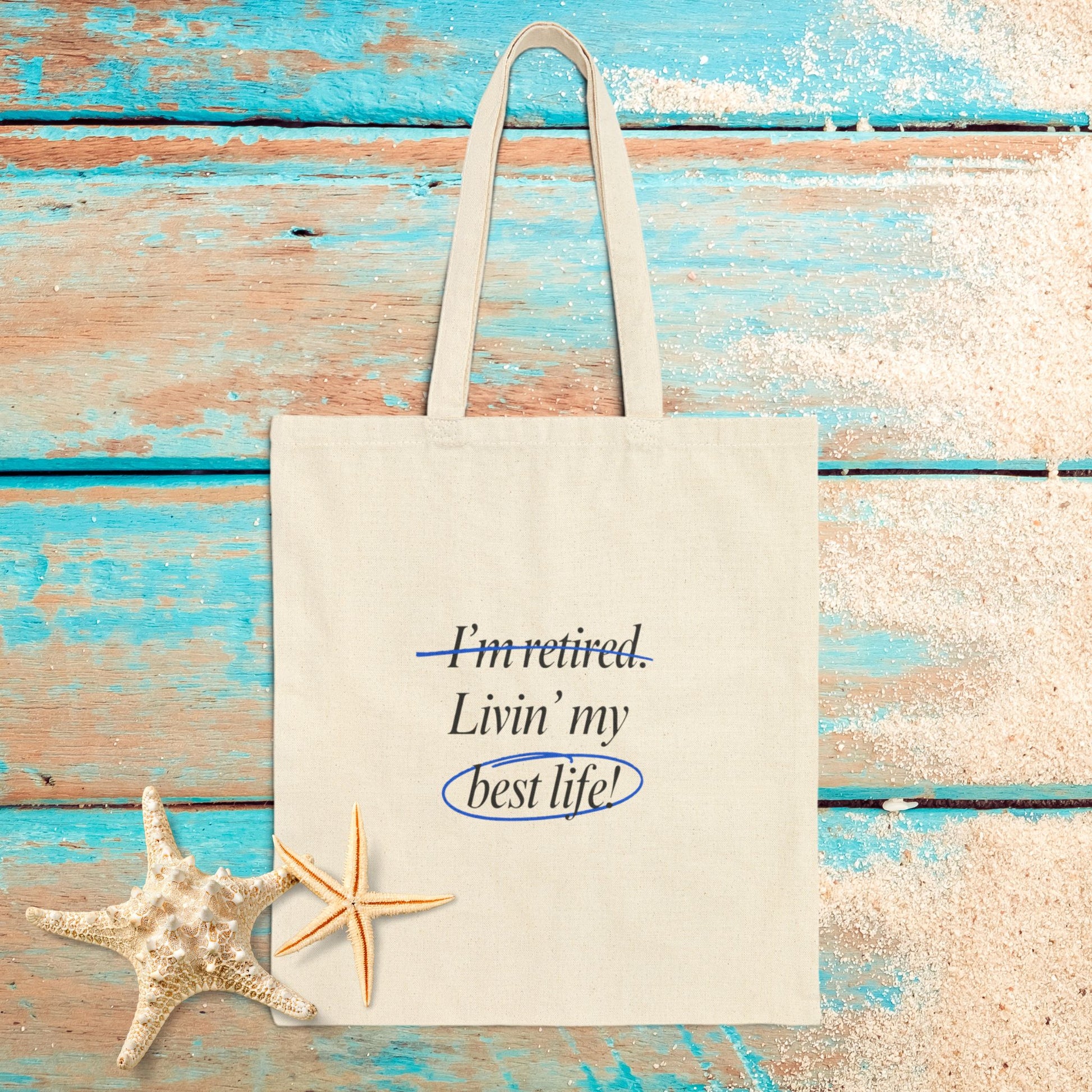 Retired? Slash that! You're livin your best life! This humorous cotton canvas tote bag makes a fun gift for coworkers, the boss, friends or just to indulge yourself. Everyday errands, trips to the farmer's market, and days at the beach will have a whole new vibe.