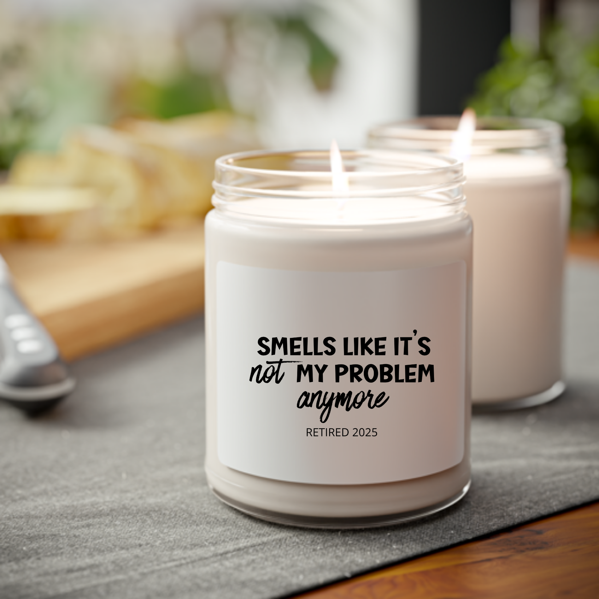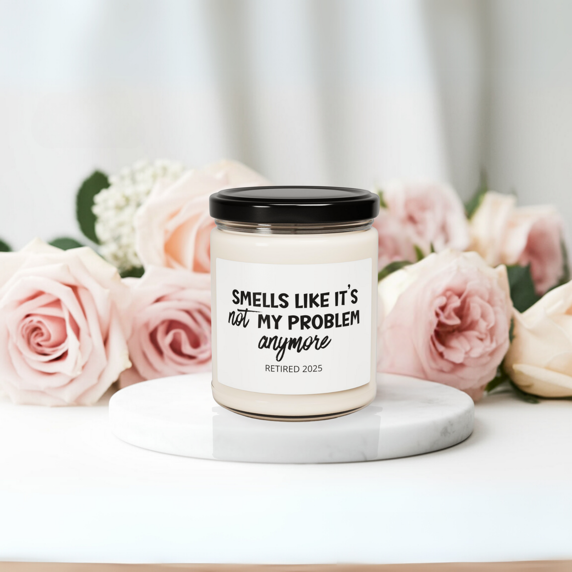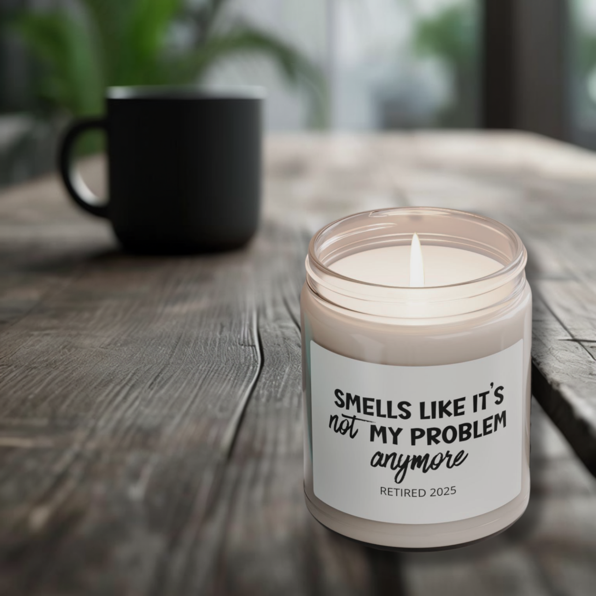 "Smells like it's not my problem anymore. Retired 2025." This humorous candle will brighten your home and makes a fun gift for coworker, the boss, friends or just to indulge yourself.